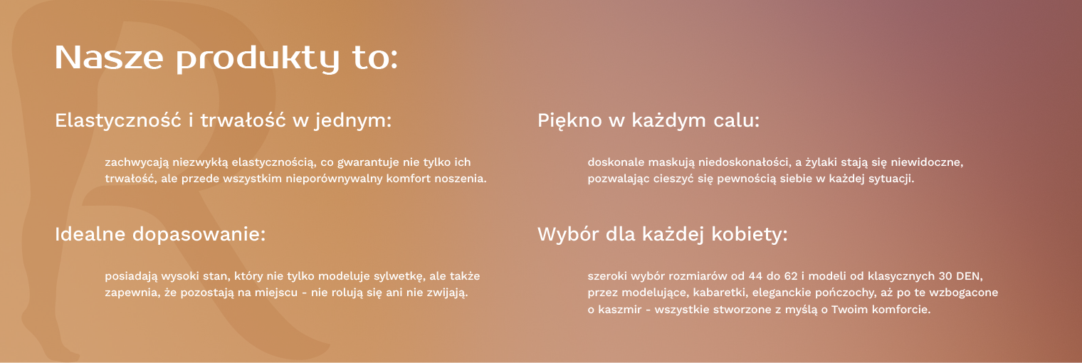 Ribessa to odpowiedź na te pragnienia. Nasze rajstopy plus size doskonale dopasowują się do sylwetki, krągłości i wzrostu, maskując przy tym niedoskonałości. Oferujemy bogaty wybór - od klasycznych rajstop, przez kabaretki, pończochy, aż po leginsy i rajstopy z dodatkiem kaszmiru, które zachwycą Cię od pierwszego założenia